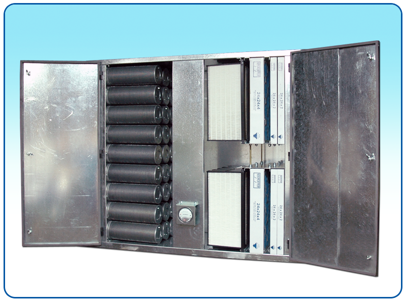 The filtration and purification unit, AFCU model, filters air from particulate matter, gas, and odors in several replaceable activated carbon filtering levels as many as HEPA H14 level.